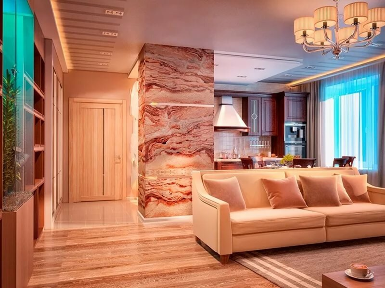4.Оформление потолка – подвесные, натяжные конструкции с разными уровнями помогут создать в гостиной праздничную или романтическую атмосферу, а кухне обеспечат необходимое равномерное освещение и рабочую обстановку. Конструктивные особенности помещения – например, несущая балка – выступят уже готовыми зонирующими элементами.