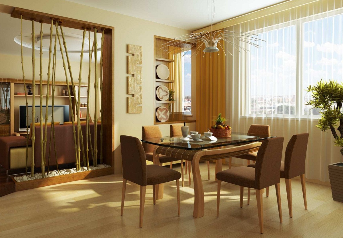 Распространенным видом зрительного разграничения пространства являются перегородки. Они не только идеально дополняют дизайн, но и решают изоляционную проблему. В качестве зонирующего элемента применяют деревянные, металлические, стеклянные или гипсокартонные конструкции. Обстановку также могут дополнить складные или раздвижные ширмы в красочном или нейтральном исполнении.