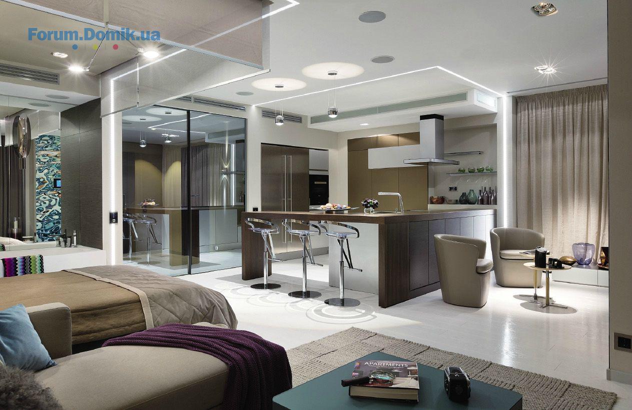 Элитная квартира с совмещенной гостиной с кухней выглядит сильно и модно. А также очень удобна и практична. В большом доме создать дизайн студии очень легко, для этого можно воспользоваться разнообразным освещением в виде напольных светильников или торшеров. Выделять зоны освещением следует правильно, чтобы создавалось ощущение объёмности и простора. Дополнительные ныне светильники могут быть в смонтированы в потолок или стену