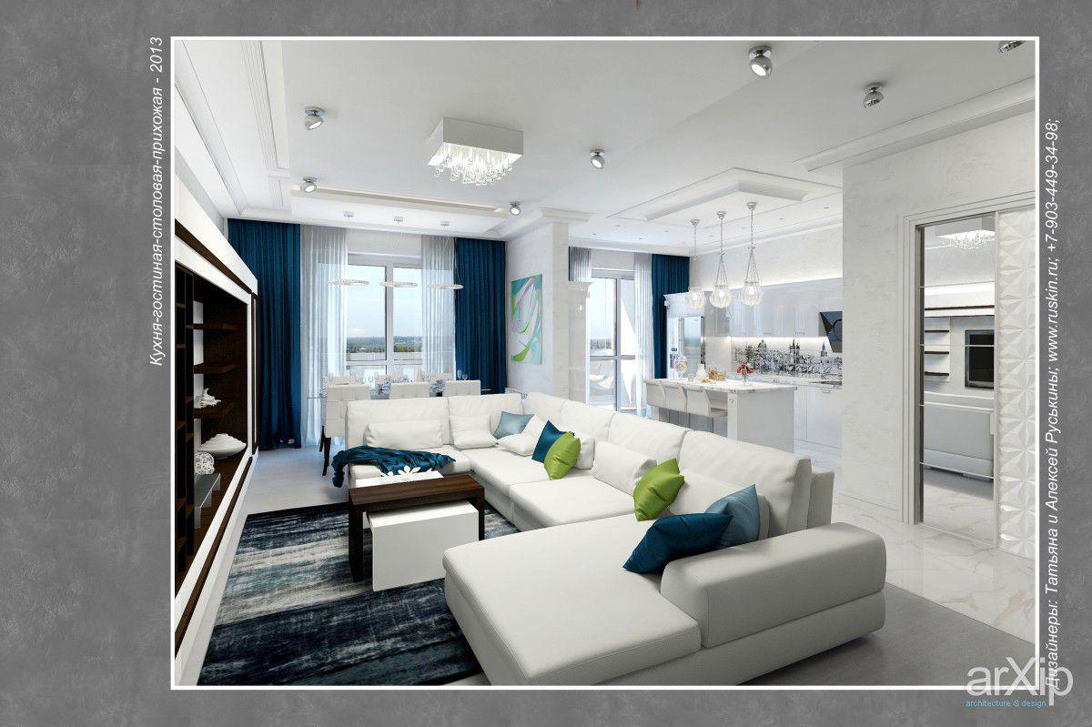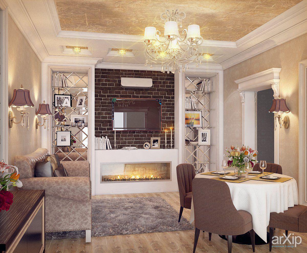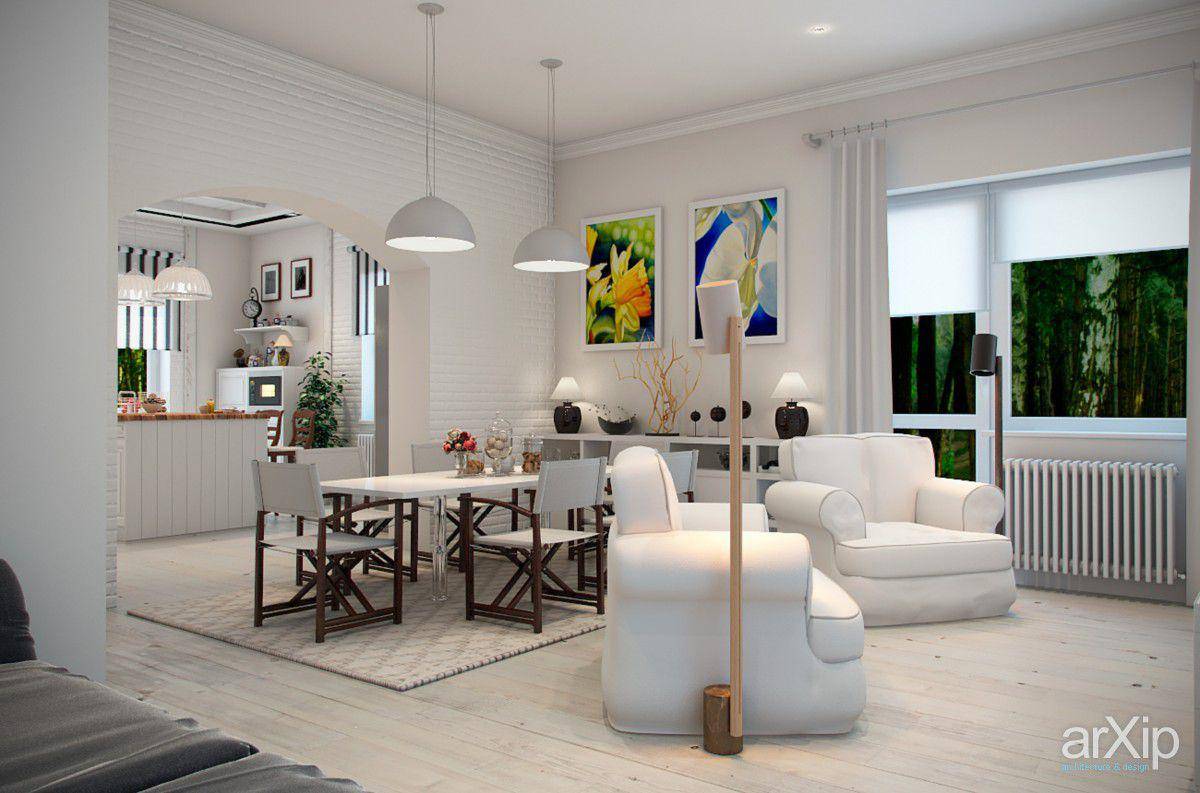 широкая арка разделяет пространство гостиной совмещенной со столовой