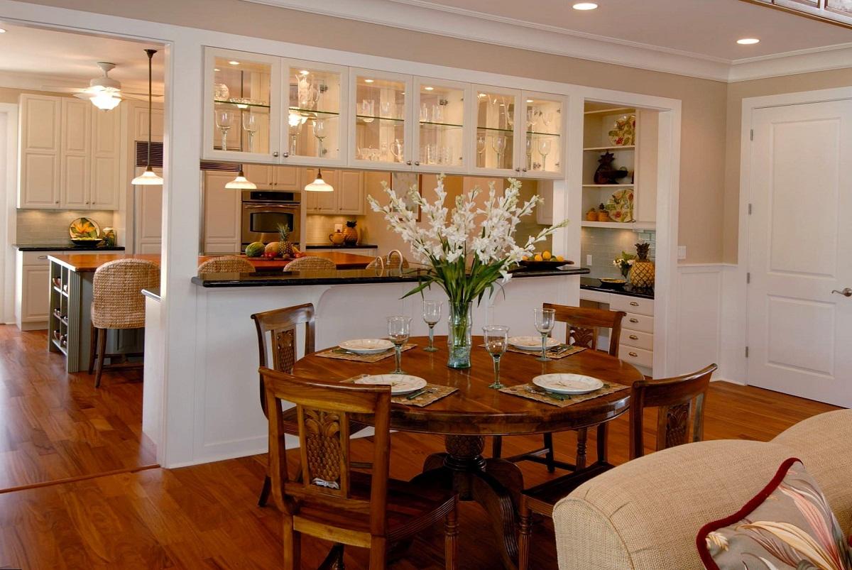 - Разместить между кухней и гостиной (или столовой) большой обеденный стол.