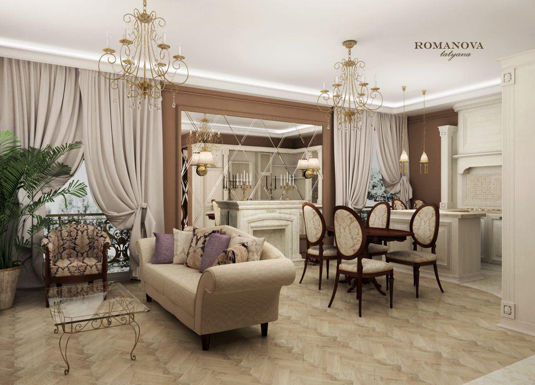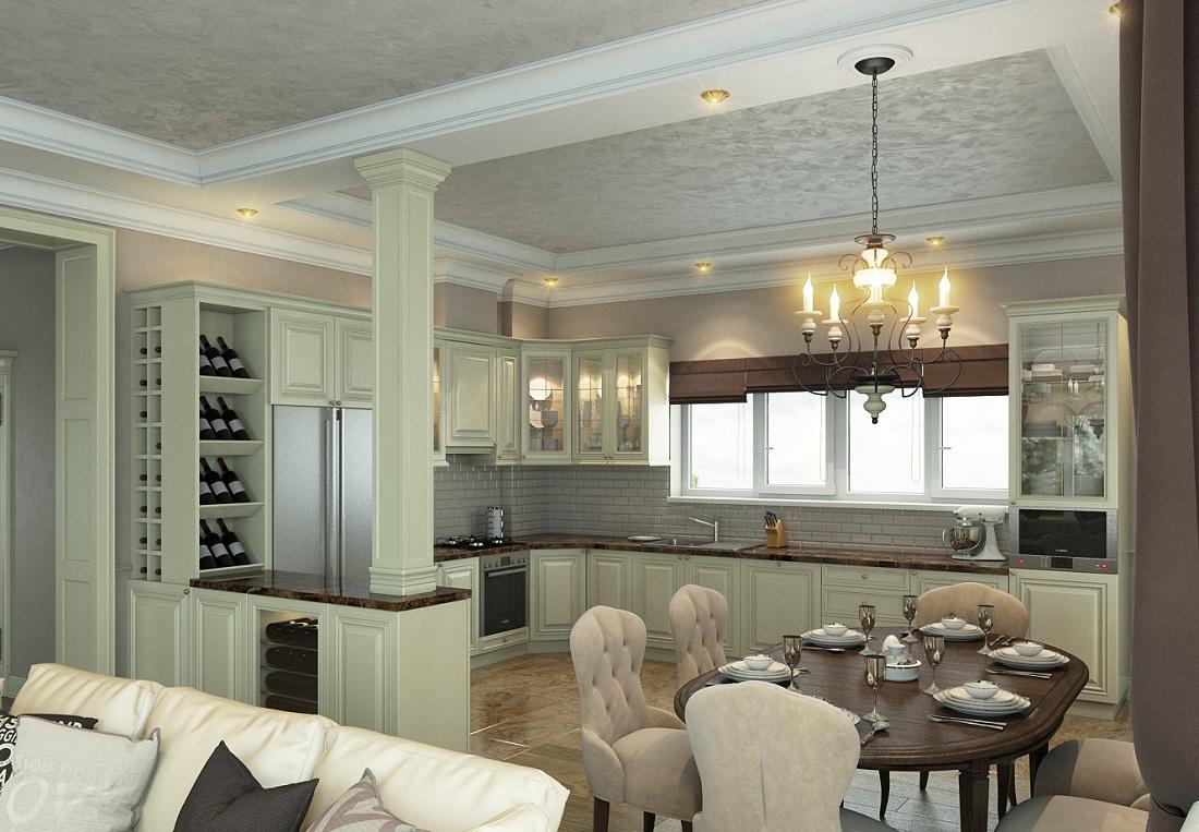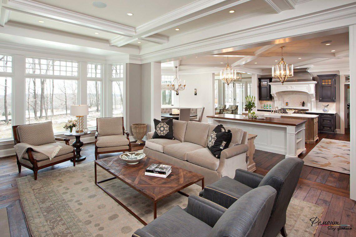 Для оформления кухни- гостиной-столовой в классическом стиле следует выбирать мебель из натурального дерева, украшенную резьбой или позолотой, диваны и кресла с обивкой, массивные, дорогие люстры. Ключевое требование классики: симметрия в дизайне, лёгкая строгость во всём и отсутствие дешёвых синтетических материалов. - В композицию совмещённого интерьера в загородном доме идеально впишется эко-стиль.
