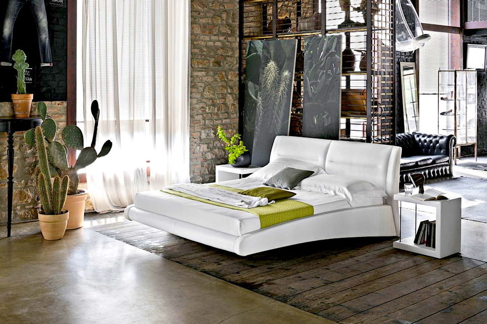 Каноны лофта предполагают грубость фактур, балки, перекрытия, коммуникации, но в спальне человек стремится отдохнуть после тяжелого дня, поэтому атмосфера комнаты должна быть умиротворяющей. Отказываться от стиля лофт в интерьере спальни не стоит. Разбавить ощущение фабричного пространства помогут винтажные элементы. К примеру уютная кровать из прошлого. И самые современные модели — светильники, тумбы, шкаф. Окна можно занавесить легкими шторами. При выборе текстиля рекомендуется придерживаться светлых тонов.