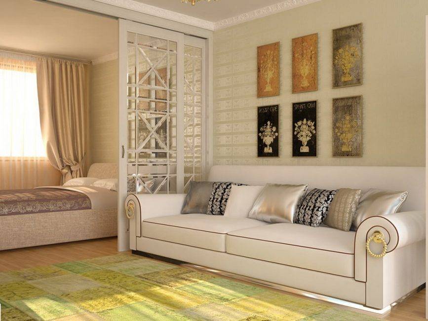 Помимо общения, развлечений и чаепития гостиную можно использовать как помещение для спальни, обычно в таком случае там отдыхают и проводят ночь именно гости. В отличие от гостиной-кухни здесь достаточно установить кровать, шкафы и кресла в разных частях комнаты, не зонируя ее дополнительной мебелью. Можно и вовсе организовать только зону для сна гостей с кроватью, небольшим шкафом и журнальным столиком.