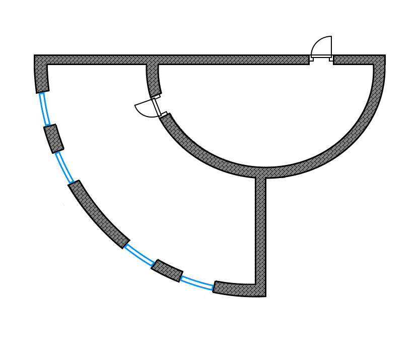 Пример планировки элитной студии полукруглой формы. На первый взгляд кажется, что неудобно расставлять мебель в квартире с полукруглыми стенами. Но дизайнеры создают практичный интерьер даже в такой планировке. Зонирование делают не только с помощью стен и передвижных конструкций, но и расставляя определенным образом мебель