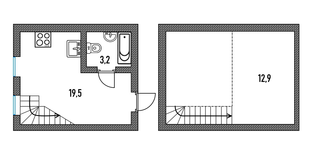 Пример планировки двухэтажной студии. Обычно такие студии встречаются в домах старого фонда — хозяева оборудуют студию в комнате коммунальной квартиры. Чтобы уместить санузлы, комнату и кухню, надстраивают второй этаж. В новостройках такие предложения редкость