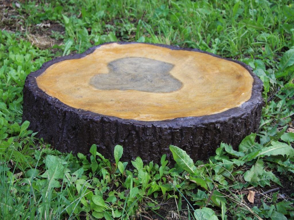 - Небольшой высоты спил (пень с корнями). Древесину нужно сначала подготовить: просушить на солнце, затем покрыть антипиренами и лаком. Главное, чтобы сечение спила было чуть больше диаметра крышки. Можно купить искусственный полимерный и очень легкий пень.