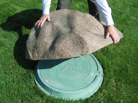 Вместо крышек, имитирующих натуральные валуны, достаточно прикрыть люк выгребной ямы гипсовым или акриловым декором для сада. Новый материал – полистоун: жидкий камень из акрила с каменной крошкой. Состав заливают в формы, после застывания окрашивают. Готовые фигуры можно оставлять на открытом воздухе круглый год.