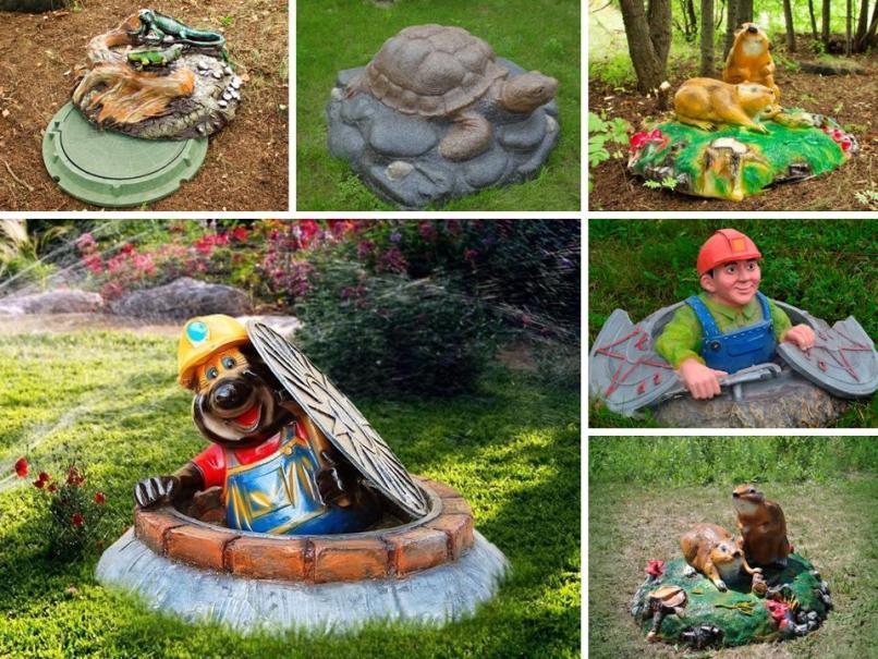 Для декорирования канализации на газонах с яркими клумбами подойдут готовые крышки с фигурами – такие изделия не просто замаскируют выгребную яму, а заставят улыбнуться.