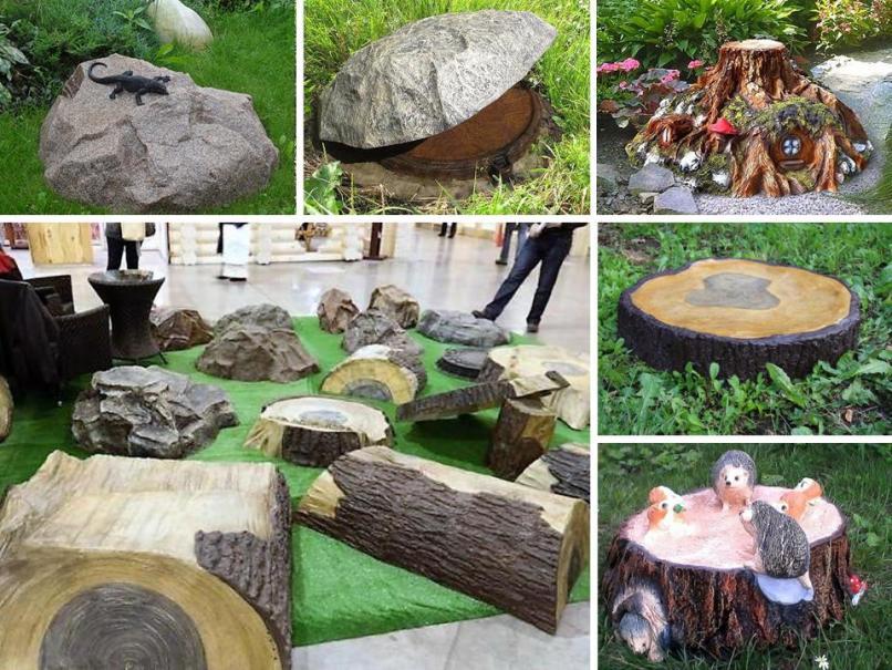 Искусственные пеньки и валуны стоят недорого, отличаются легкостью, компактностью, не требуют привлечения специалистов для установки у дома. Декоративный элемент с легкостью поднимет не только взрослый мужчина, но и женщина или подросток. Переносить на другое место их тоже несложно, как и убрать на зиму для хранения в сарай.