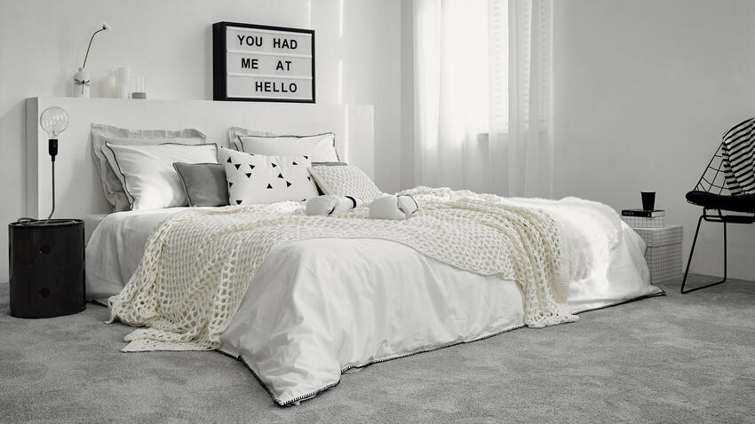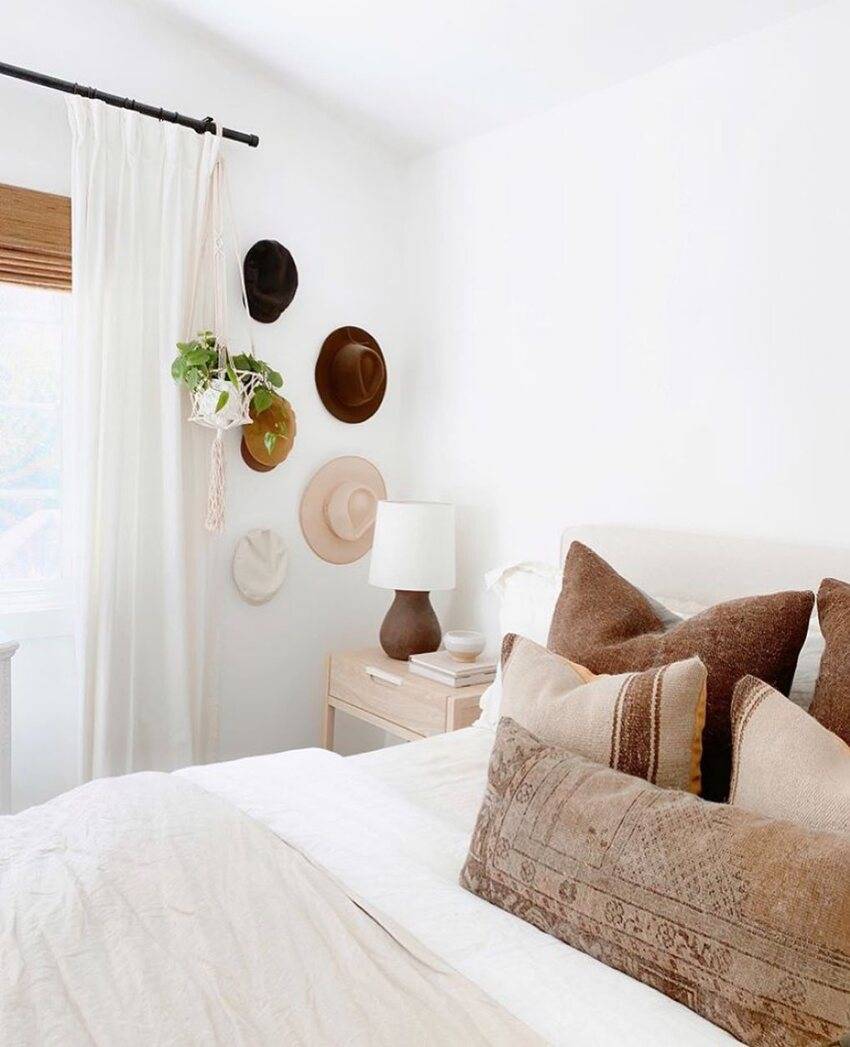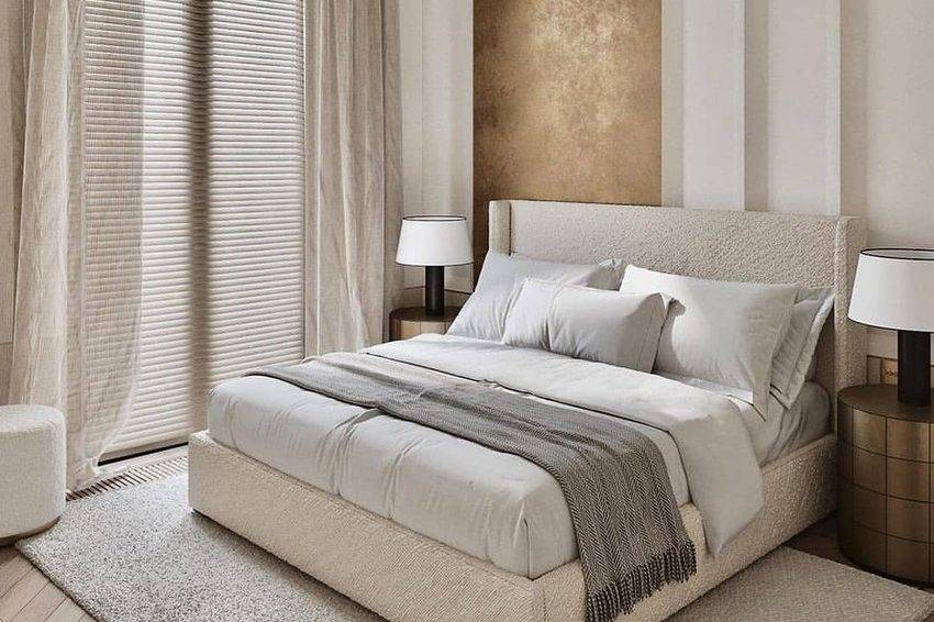 Выбор более узкой кровати позволит разместить в спальне небольшие тумбочки