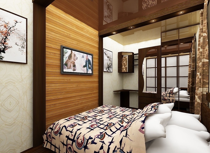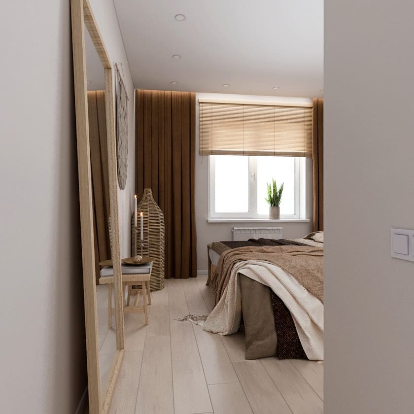 Визуальное расширение пространства в данном случае достигается за счет реализации следующих идей дизайна спальни: