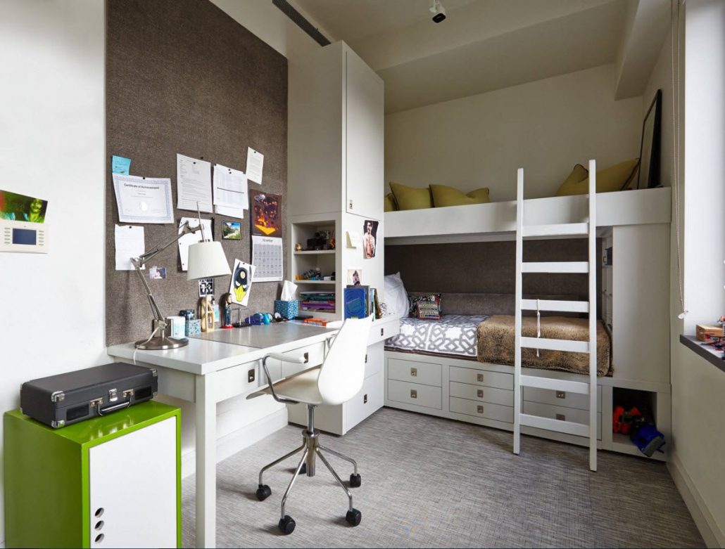 - если позволяет высота, то организовать подиум, куда будет спрятана кровать, а сверху поставить письменный стол;