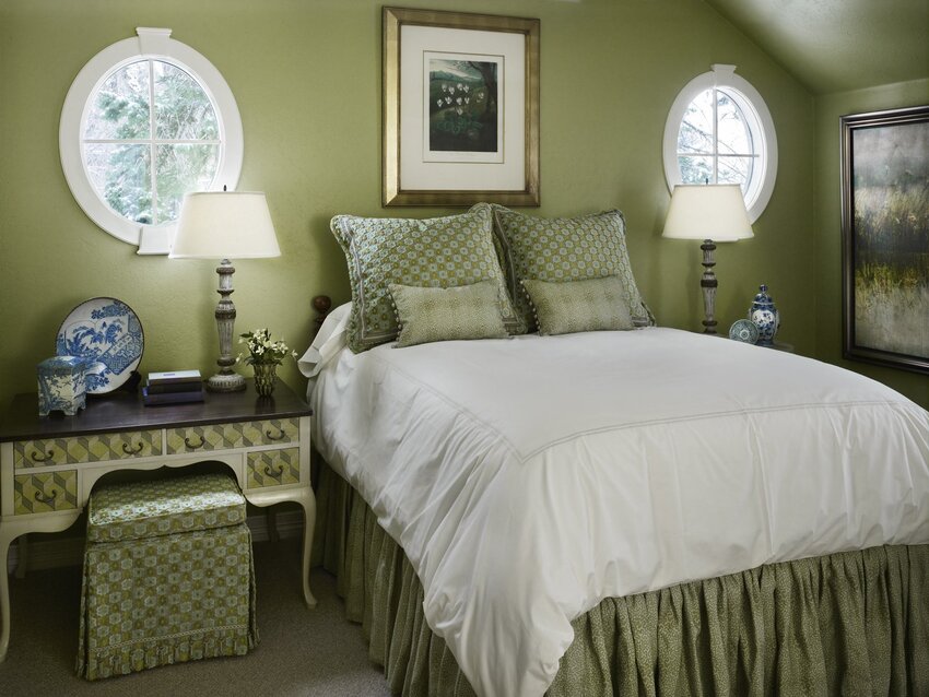 Эксперименты с цветом. Чтобы изменить визуальное восприятие спальни, можно оформить нижнюю треть с помощью темных оттенков, а остальное пространство — с помощью светлых. За счет этого комната будет казаться больше, чем на самом деле. Стык можно закрыть декоративным плинтусом, чтобы такой дизайн смотрелся органично.