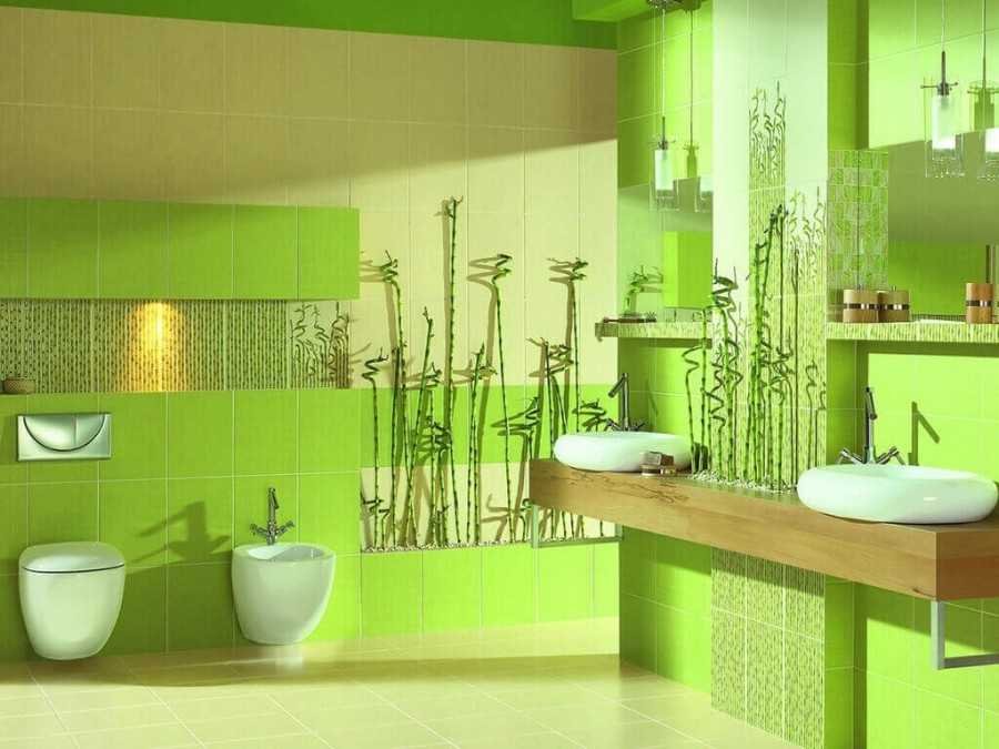 Само собой, первым делом нужно выбрать основной фон помещения. В маленьких ванных комнатах не стоит использовать темные цвета, так как они визуально уменьшают помещение. Идеальным тонами для оформления миниатюрных санузлов являются белый, бежевый и некоторые другие теплые оттенки. Если в ванной комнате есть, где “разгуляться”, не бойтесь экспериментировать с расцветками. Например, очень эффектно смотрится оформление санузла в таких контрастных цветовых сочетаниях, как фиолетовый-белый, салатовый-бежевый, лазурный-песочный. Что касается отделочных материалов, оптимальным является кафельная плитка. Она неприхотлива в уходе и имеет эстетичный внешний вид. Сегодня с помощью кафельной плитки можно создавать великолепные узоры, превращающие дизайн ванной комнаты в настоящее произведение искусства.