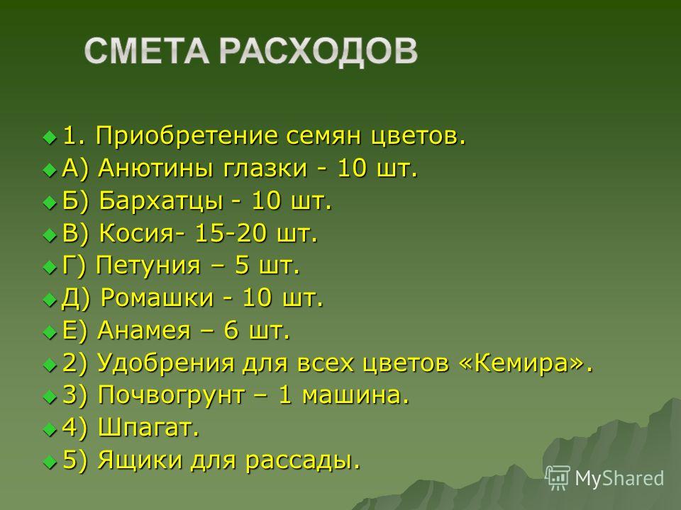 1. Приобретение семян цветов. 1. Приобретение семян цветов. А) Анютины глазки – 10 шт. А) Анютины глазки – 10 шт. Б) Бархатцы – 10 шт. Б) Бархатцы – 10 шт. В) Косия шт. В) Косия шт. Г) Петуния – 5 шт. Г) Петуния – 5 шт. Д) Ромашки – 10 шт. Д) Ромашки – 10 шт. Е) Анамея – 6 шт. Е) Анамея – 6 шт. 2) Удобрения для всех цветов «Кемира». 2) Удобрения для всех цветов «Кемира». 3) Почвогрунт – 1 машина. 3) Почвогрунт – 1 машина. 4) Шпагат. 4) Шпагат. 5) Ящики для рассады. 5) Ящики для рассады.