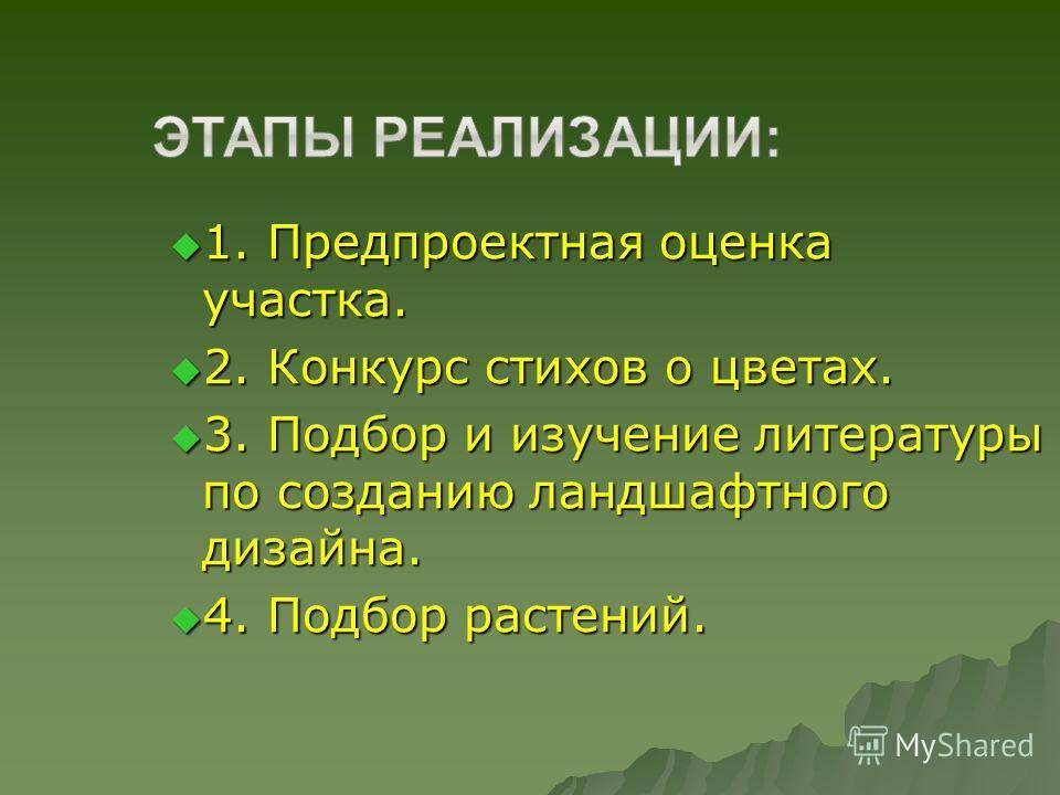 1. Предпроектная оценка участка. 1. Предпроектная оценка участка. 2. Конкурс стихов о цветах. 2. Конкурс стихов о цветах. 3. Подбор и изучение литературы по созданию ландшафтного дизайна. 3. Подбор и изучение литературы по созданию ландшафтного дизайна. 4. Подбор растений. 4. Подбор растений.