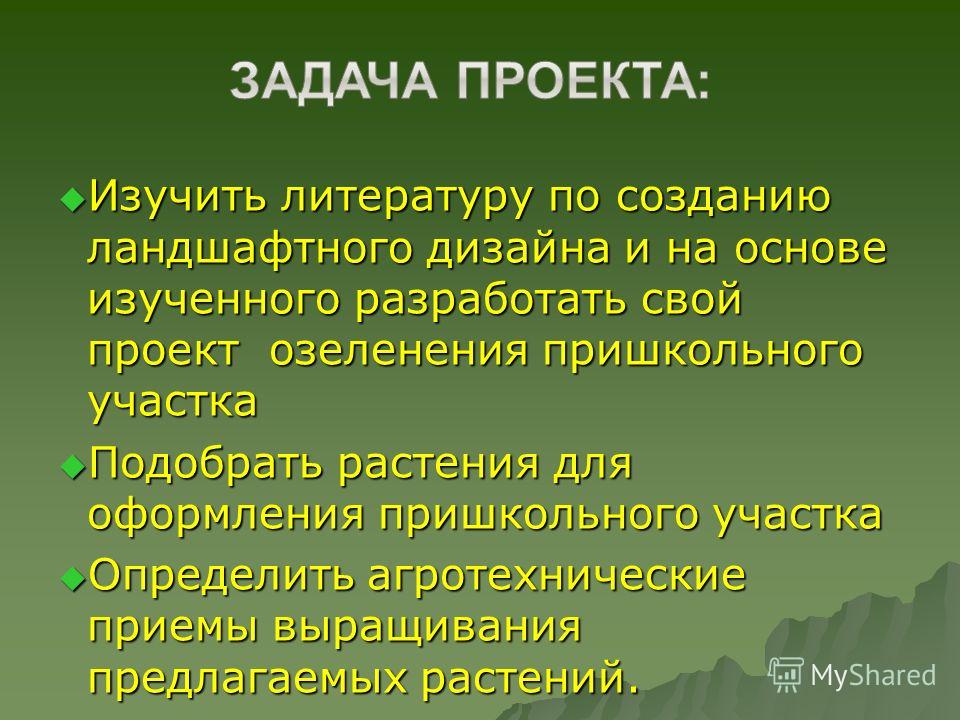 Изучить литературу по созданию ландшафтного дизайна и на основе изученного разработать свой проект озеленения пришкольного участка Изучить литературу по созданию ландшафтного дизайна и на основе изученного разработать свой проект озеленения пришкольного участка Подобрать растения для оформления пришкольного участка Подобрать растения для оформления пришкольного участка Определить агротехнические приемы выращивания предлагаемых растений. Определить агротехнические приемы выращивания предлагаемых растений.