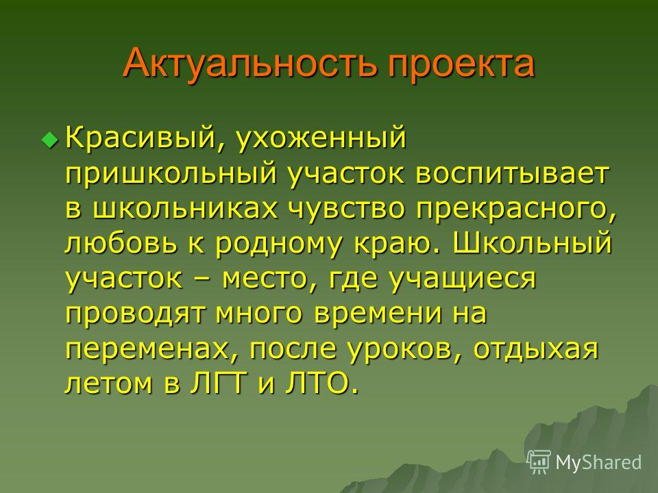 Актуальность проекта Красивый, ухоженный пришкольный участок воспитывает в школьниках чувство прекрасного, любовь к родному краю. Школьный участок – место, где учащиеся проводят много времени на переменах, после уроков, отдыхая летом в ЛГТ и ЛТО. Красивый, ухоженный пришкольный участок воспитывает в школьниках чувство прекрасного, любовь к родному краю. Школьный участок – место, где учащиеся проводят много времени на переменах, после уроков, отдыхая летом в ЛГТ и ЛТО.