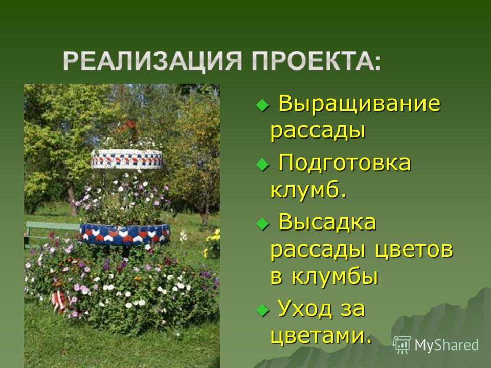 Выращивание рассады Выращивание рассады Подготовка клумб. Подготовка клумб. Высадка рассады цветов в клумбы Высадка рассады цветов в клумбы Уход за цветами. Уход за цветами.