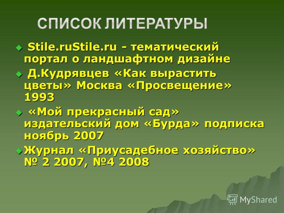 Stile.ruStile.ru – тематический портал о ландшафтном дизайне Stile.ruStile.ru – тематический портал о ландшафтном дизайне Д.Кудрявцев «Как вырастить цветы» Москва «Просвещение» 1993 Д.Кудрявцев «Как вырастить цветы» Москва «Просвещение» 1993 «Мой прекрасный сад» издательский дом «Бурда» подписка ноябрь 2007 «Мой прекрасный сад» издательский дом «Бурда» подписка ноябрь 2007 Журнал «Приусадебное хозяйство» , Журнал «Приусадебное хозяйство» ,