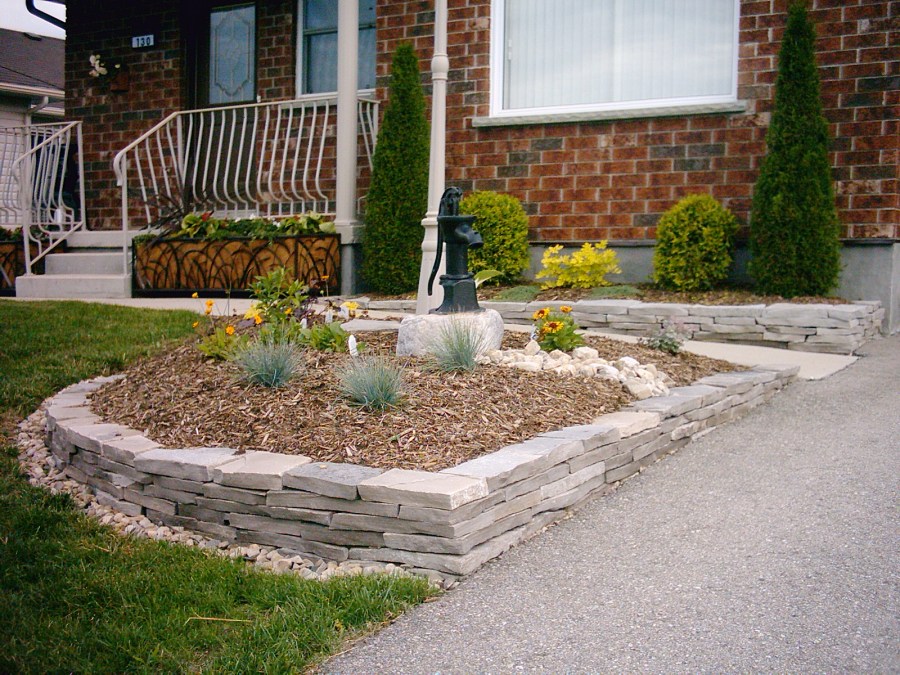 Наземная часть обрамления должна иметь небольшой уклон внутрь. Для ее обустройства применяют ровные булыжники. Чтобы не испортить вид кладки, щели заделываются раствором изнутри. С поверхности надо убрать верхний слой земли, уложить дренаж и засыпать плодородной землей. Высадка растений производится через 2-3 дня, после просадки грунта.
