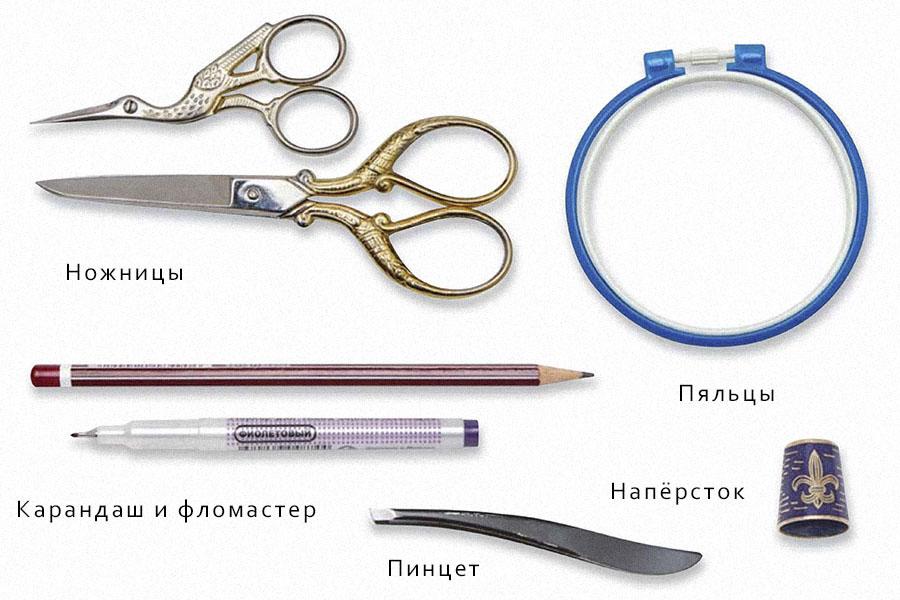 В процессе работы ткань и нитки приходится обрезать, основу нужно разметить, закрепить в нужном положении. Для этого используют дополнительные инструменты.