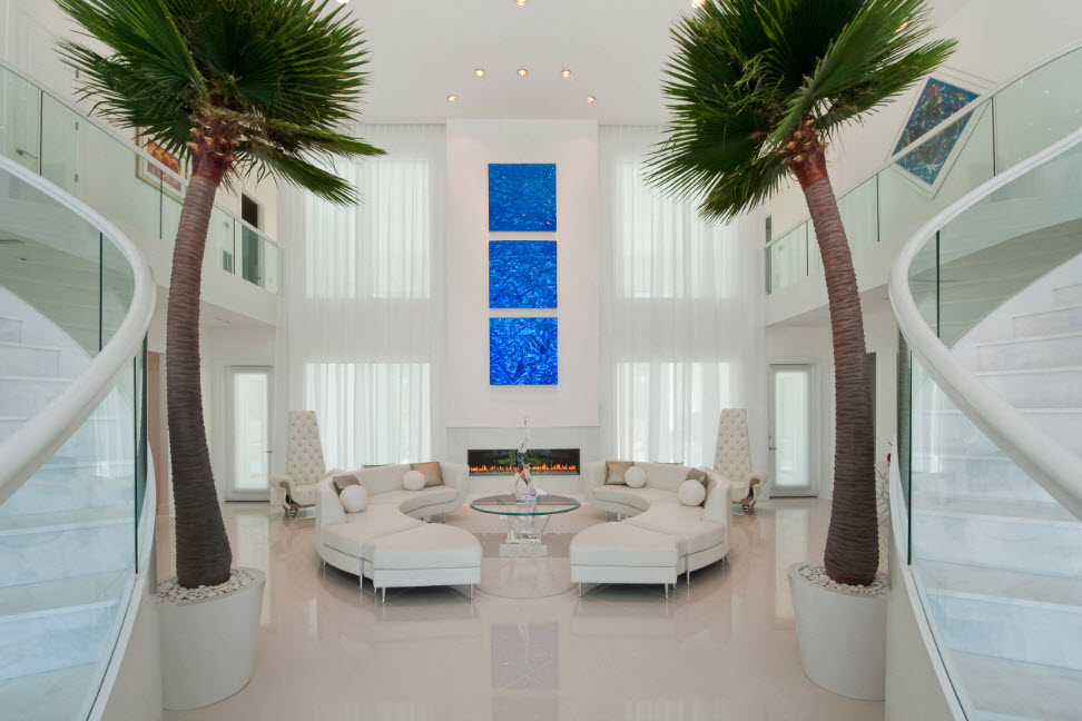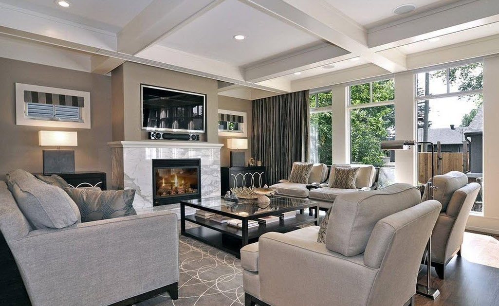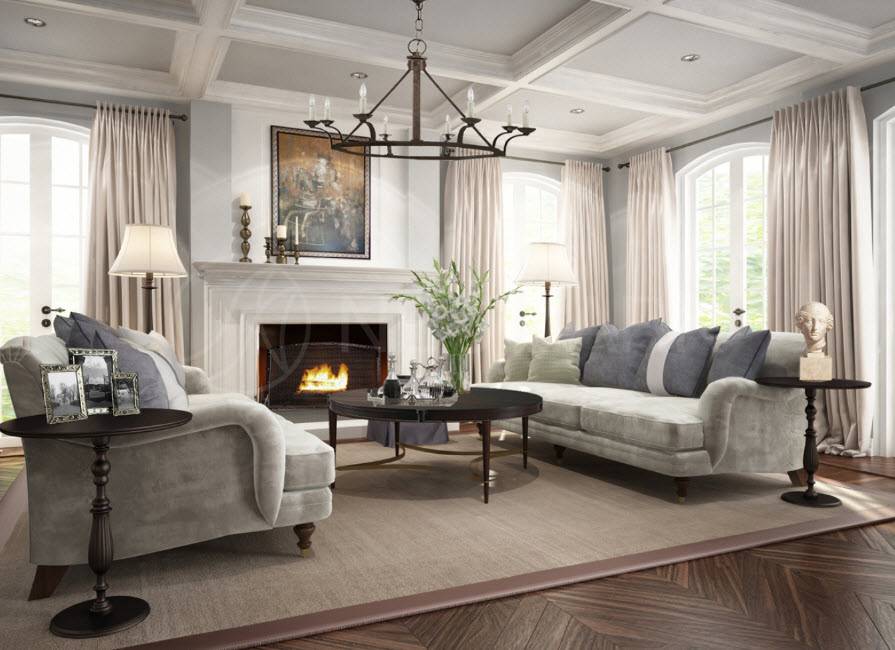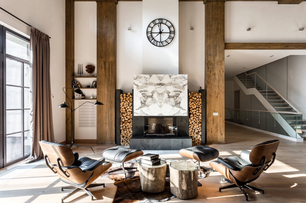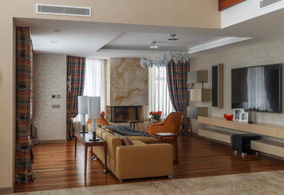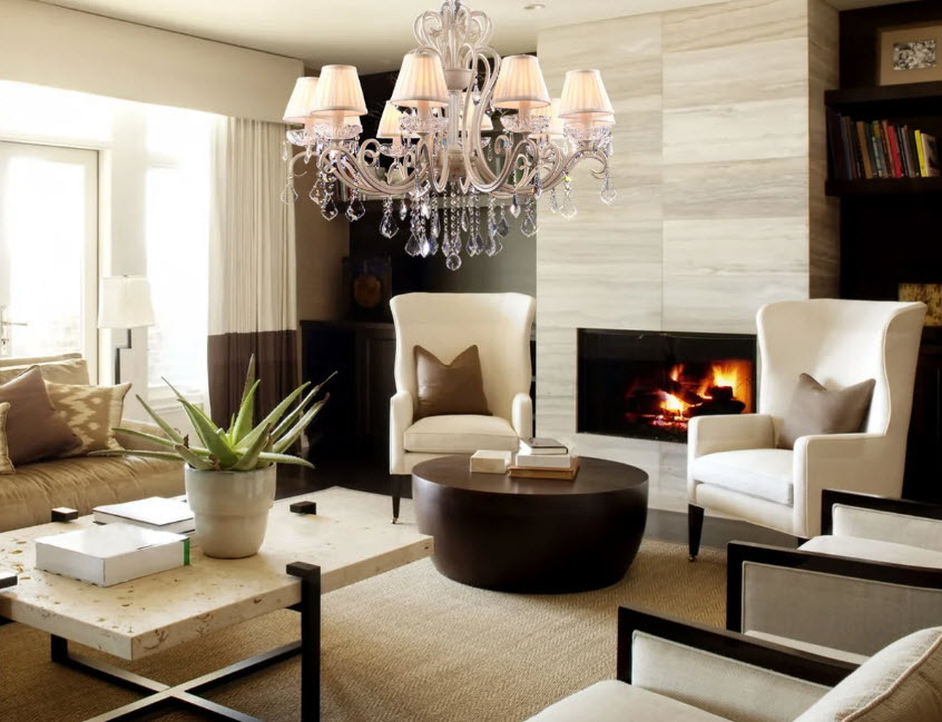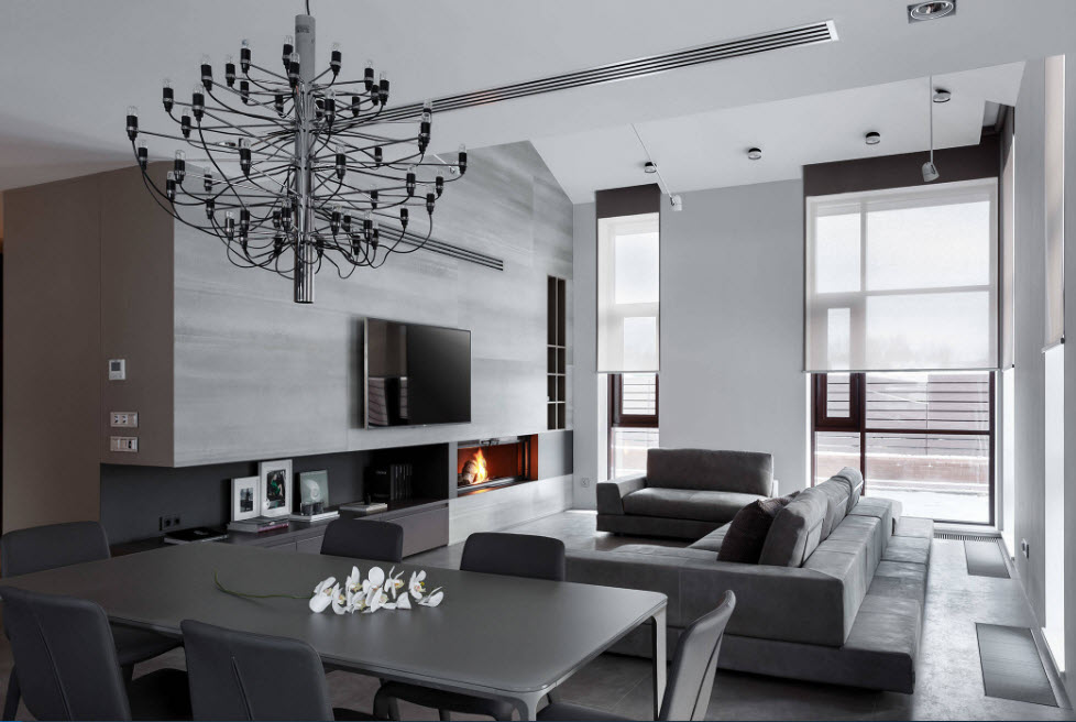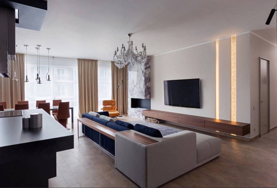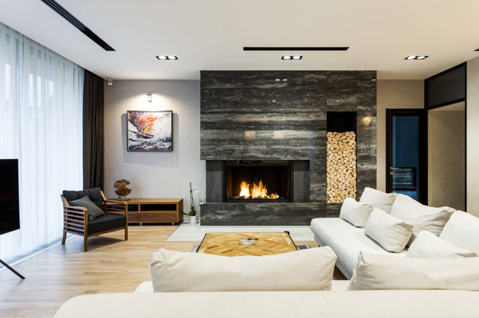 Важно помнить, что недостаточное количество света превратит интерьер большой гостиной в невыразительное и скучное помещение, которое будет «убивать» чувство уюта и комфорта. Исправить эту ситуацию способен лишь один предмет – камин, который прекрасно вписывается в интерьер большой современной гостиной