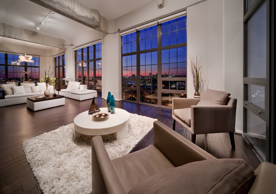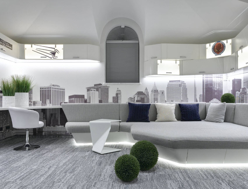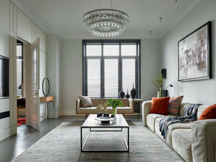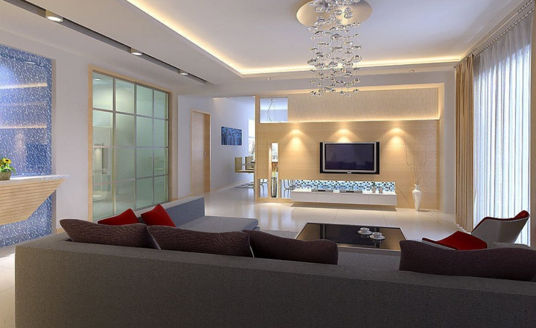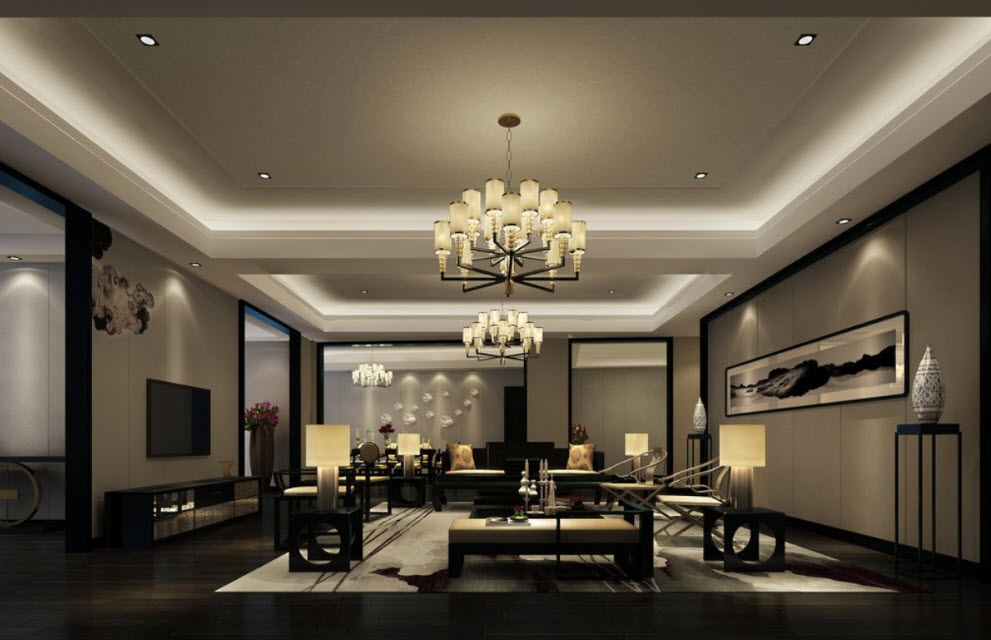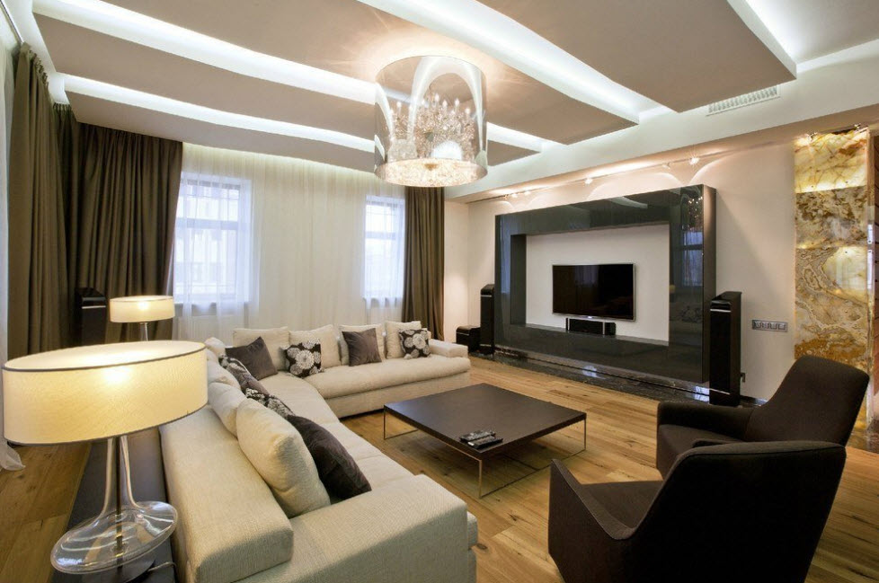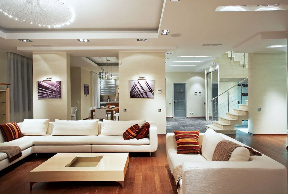Для того чтобы большая комната была уютной и комфортной важно позаботиться о системе освещения, выборе светильников. Находясь в большом помещении важно, чтобы оно было хорошо освещено, поэтому здесь должно быть несколько типов освещения