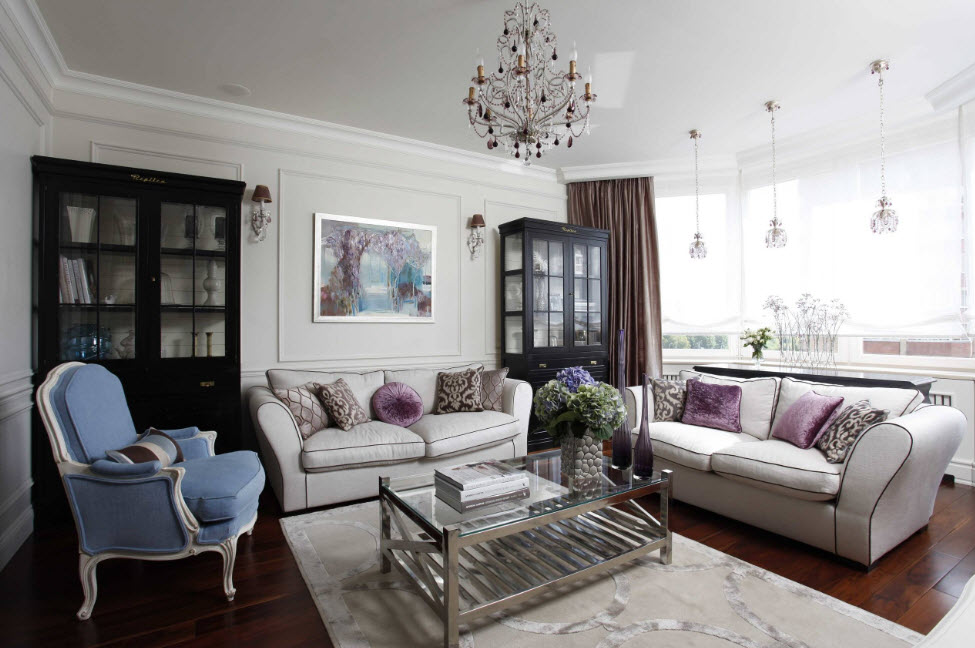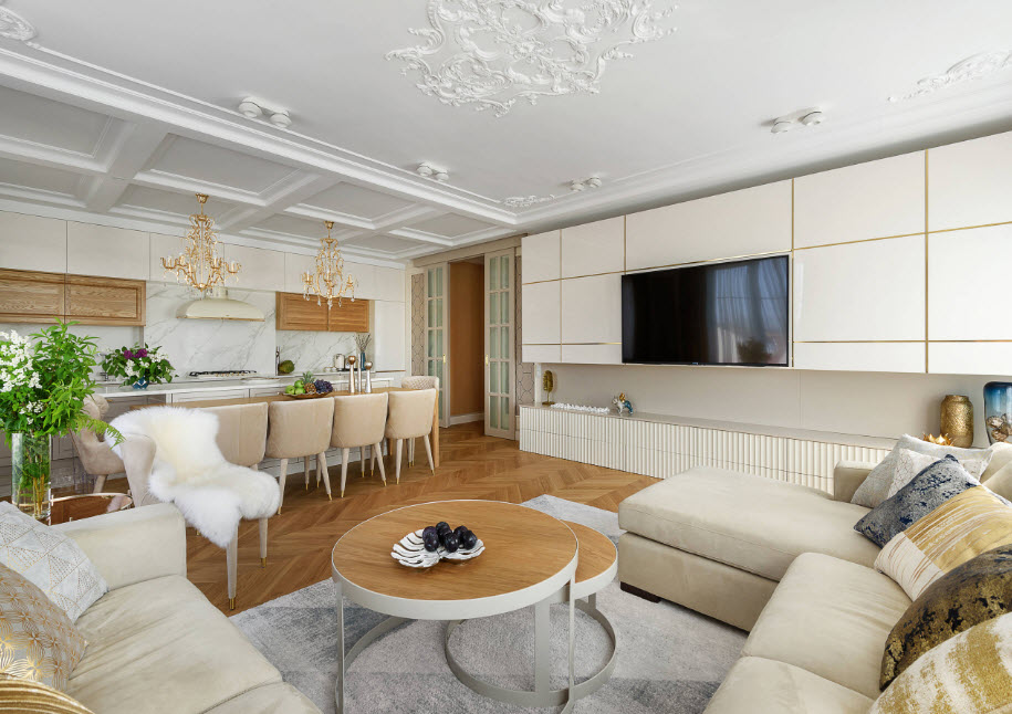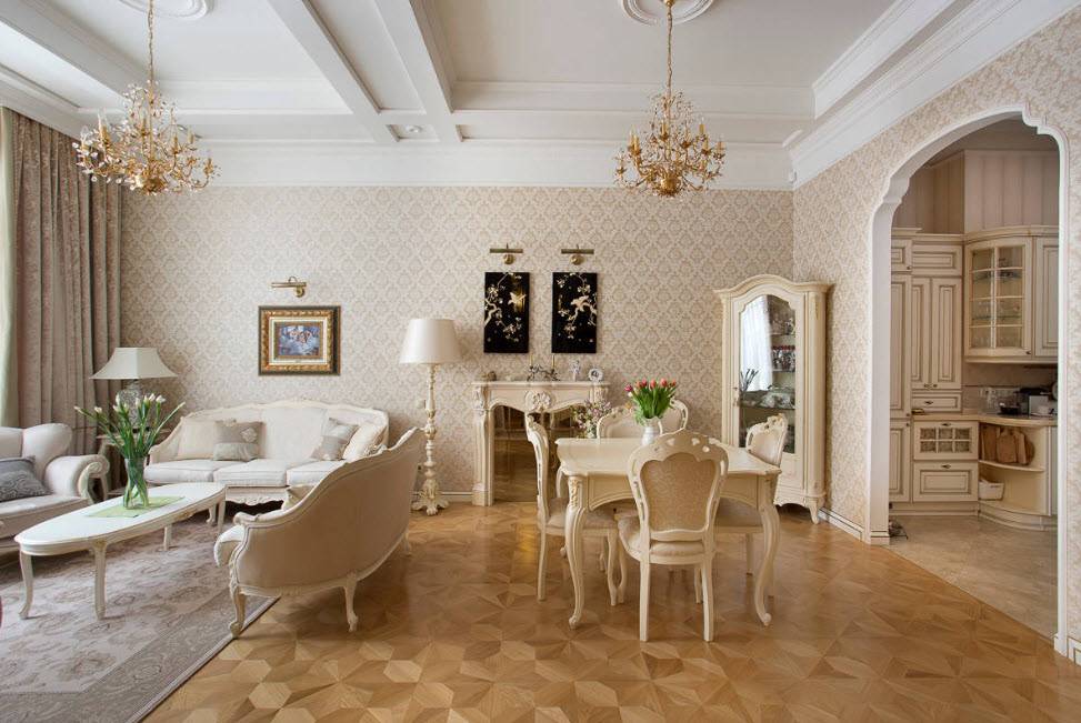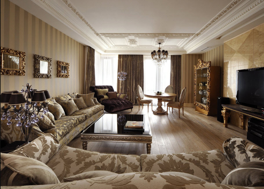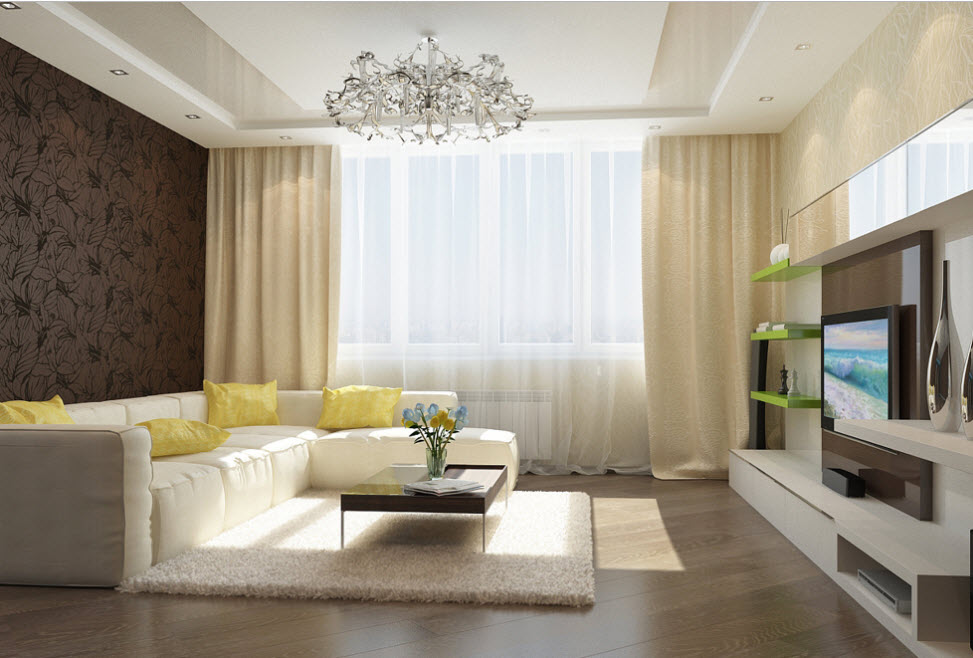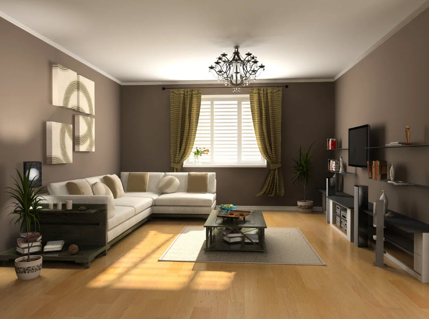 Прежде всего, хотелось бы сказать о цветовой гамме отделочных материалов, используемых для оформления большой гостиной. Конечно же, особых ограничений здесь нет, но все же дизайнеры не рекомендуют использовать темные материалы, отдавая предпочтение более светлым тонам. Единственное исключением – это темно-коричневый или шахматный черно-белый пол. Для стен и потолка лучше выбирать светлые оттенки, наполняющие комнату воздухом и чувством свободы.