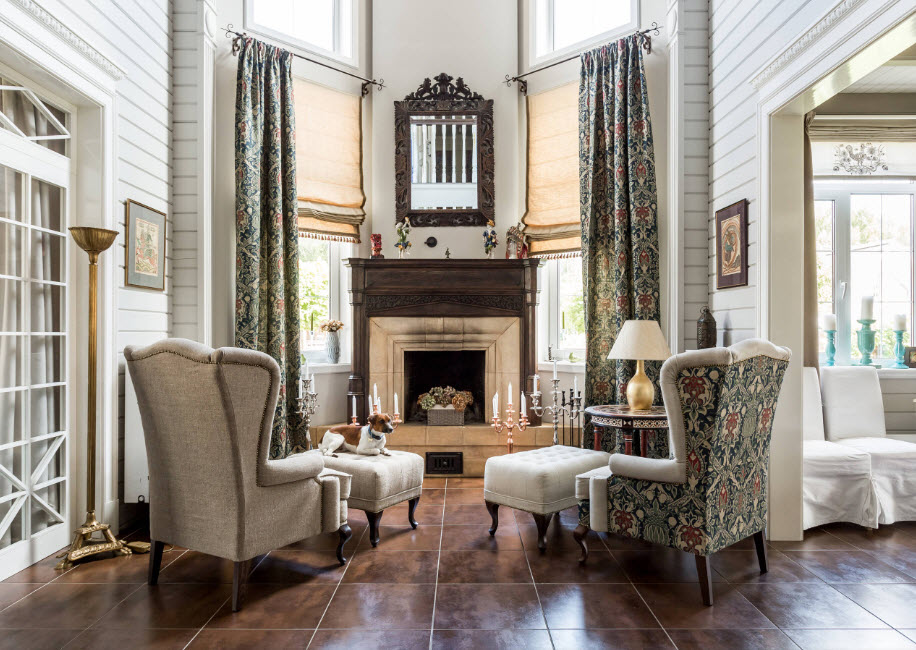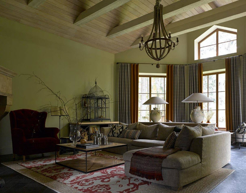 Для пола можно использовать паркет или ламинат, линолеум и деревянную доску, керамическую плитку или ковролин. Отделку стен можно произвести с помощью кирпичной или каменной кладки, фактурной штукатурки или обоев. Потолок должен блестеть и сеять, поэтому оставить его без внимания нельзя. Лучшим решением является натяжная конструкция с глянцевой поверхностью, при этом цвет должен быть чуть светлее, чем поверхность стен. Альтернативное решение – подвесные или крашеные потолки теплой и мягкой цветовой палитры.