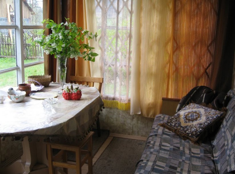 объединять комнаты дачи – комфортность и уют. Старый журнальный столик можно
