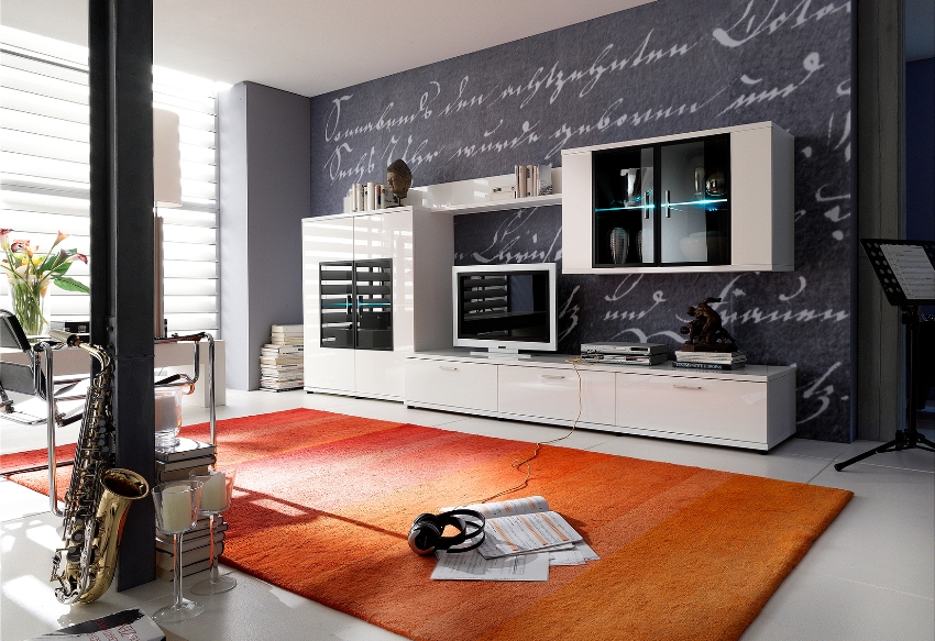 Для размещения посуды существуют специальные серванты или стеклянные витрины. Для создания мини-библиотеки должно быть предусмотрено множество полок с небольшим пространством между ними. Мебель в гостиную под телевизор, аудиотехнику, видеоаппаратуру содержит полки больших размеров. Также в комплект могут входить нижние выдвижные ящики, комоды, стеллажи для декоративных элементов, пеналы для вещей.