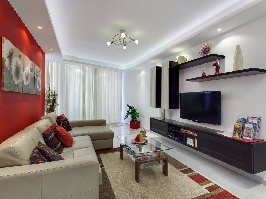 Гостиная красного цвета. Если использовать не самые яркие оттенки красного, а например, бордовый или вишневый в сочетании с белым или серым, то маленькая гостиная сразу преобразиться.