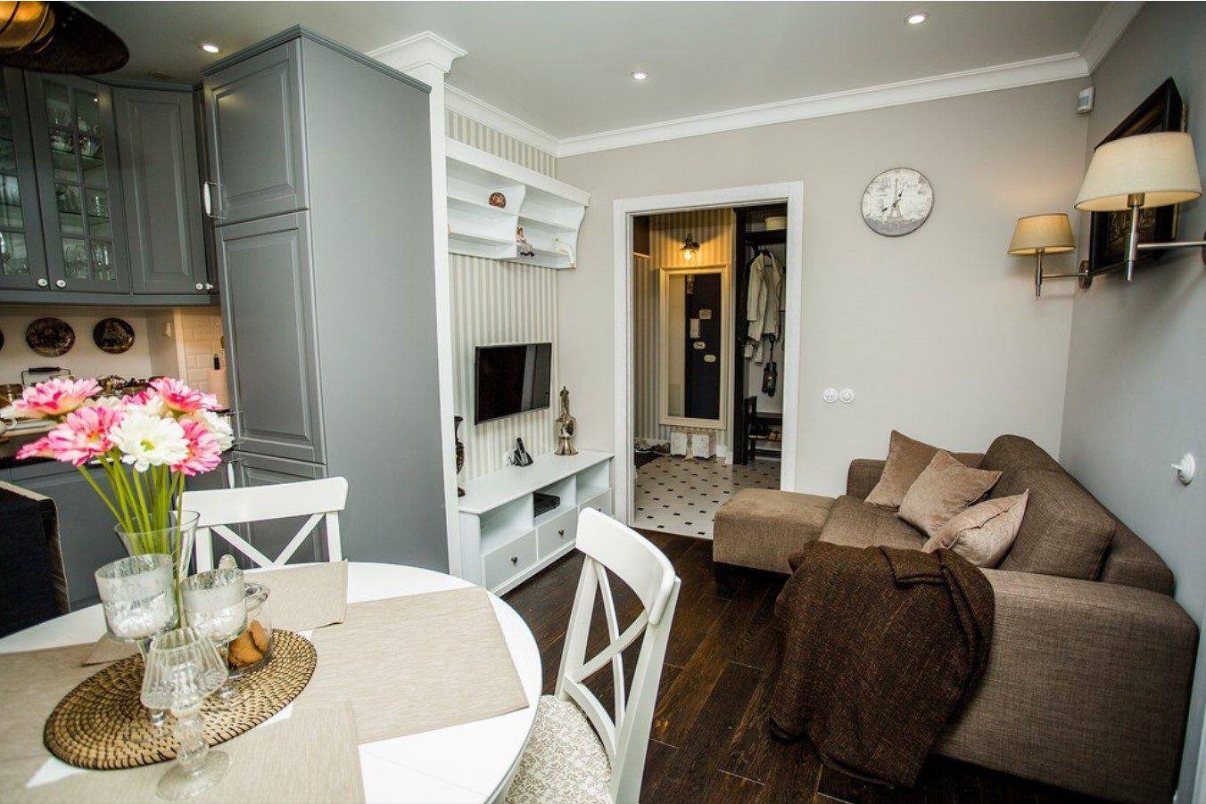 В непосредственной близости к двери можно поставить маленький диван и столик. Организовать место для хранения вещей можно в подвесных полках, сэкономив пространство. Телевизор в маленьких помещениях лучше располагать на стене.