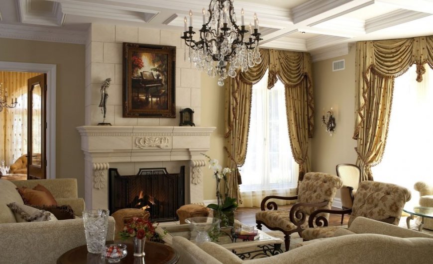 На многочисленных фото классической гостиной видно, что обязательным элементом вступает камин. Каминную полочку можно украсить старинными часами, витиеватыми подсвечниками или статуэтками.