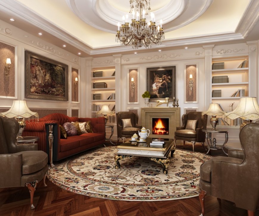 Создавая классический стиль в интерьере, нужно знать о том, что одной из его основных черт является симметрия. Это выражается в том, что предметы мебели размещаются симметрично относительно выбранного центра – камина, чайного столика, ковра. В отношении расположения мебели возможны вариации, здесь многое зависит от площади помещения, общих требований к гостиной, ваших возможностей.