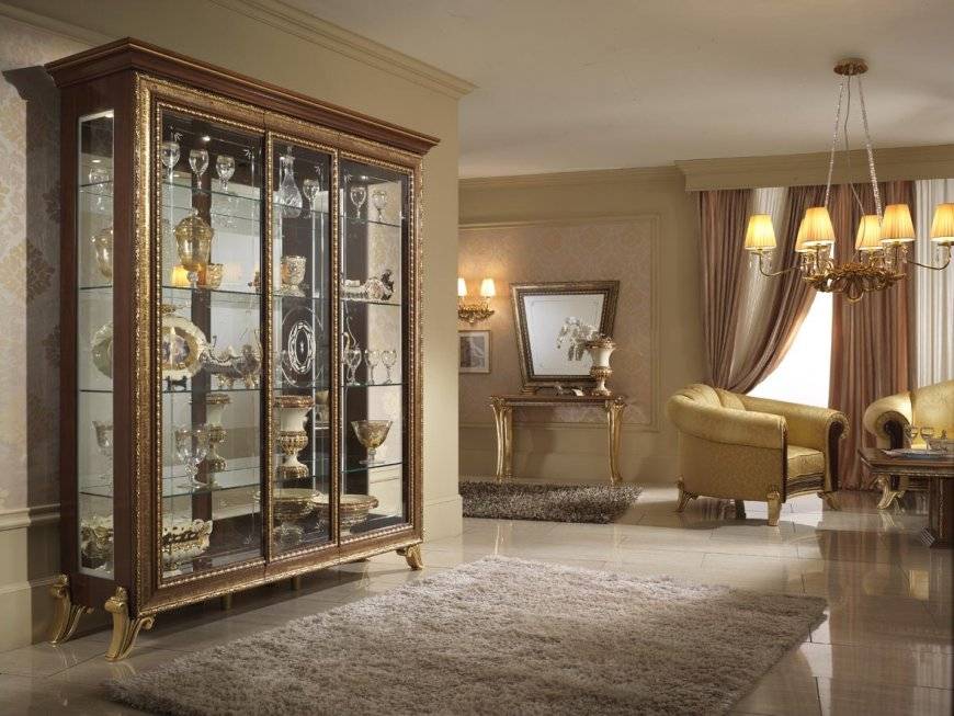 Классическая корпусная мебель в гостиную, выполненная настоящим мастером, имеет сложный рельеф и резьбу, украшена позолоченными деталями и изогнутыми ножками. Для работы используют дорогую древесину: черное или красное дерево, эвкалипт, яблоню.