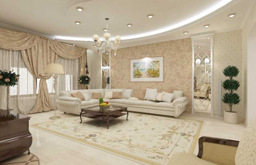 Это многофункциональная поверхность в классических гостиных. Он является элементом декора, корректором пространства, участником зонирования. Чтобы создать иллюзию высоты комнаты потолок отделывают светлыми красками с глянцем.