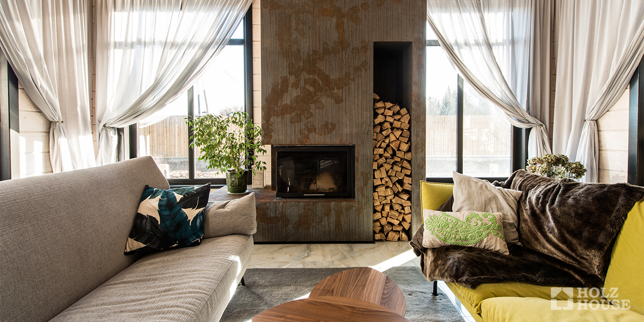 Кроме того, важно позаботиться об установке эффективной системы отопления, чтобы равномерно распределять тепло в зимнее время года. В просторных помещениях часто устанавливают массивные камины, располагая перед ними большие мягкие диваны