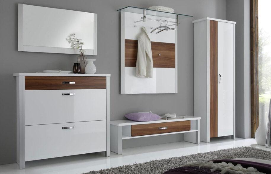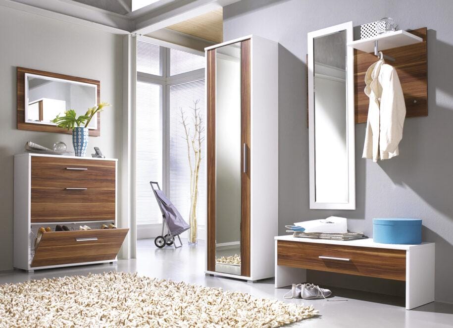Вместить в крошечный коридор все на свете не получится, поэтому нужно выбрать необходимый минимум. Джентльменский набор: шкаф или комод, вешалка, полочка для шарфов, шапок и перчаток, место для обуви, зеркало.