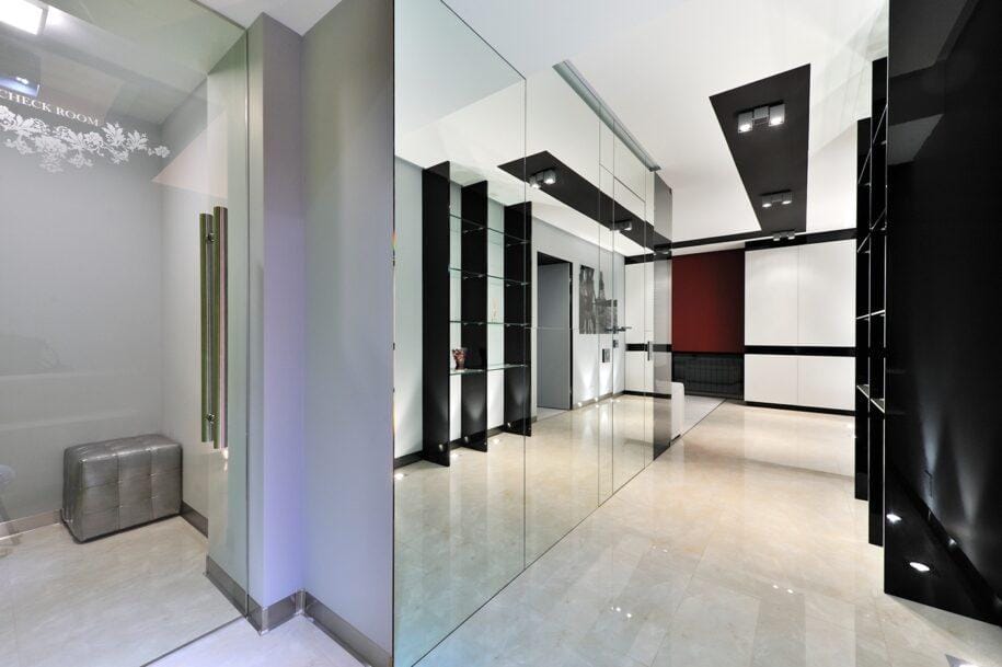 В современный небольшой коридор также стоит добавить больше света, тем более что в нем обычно нет окон. Тем не менее, есть простой способ сделать это. Двери, ведущие в соседние помещения, должны быть застеклены. В результате комната будет ярче, а значит и будет казаться больше.