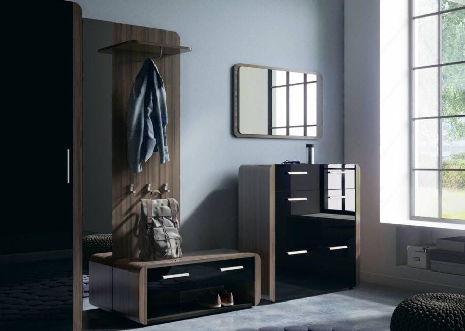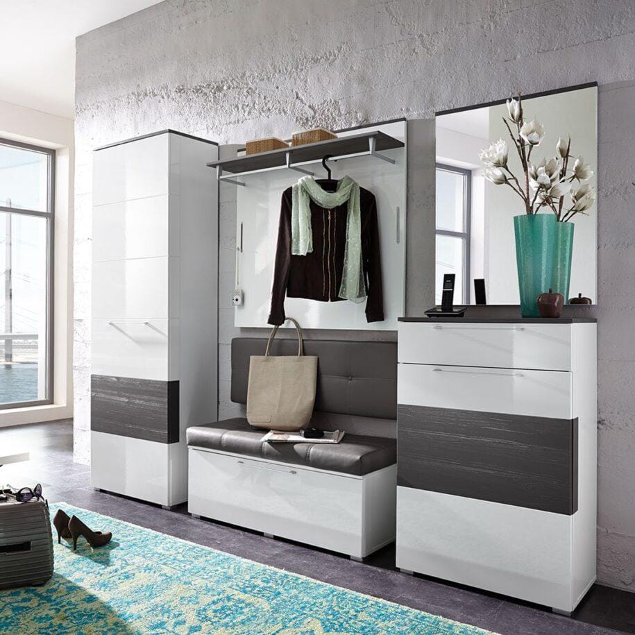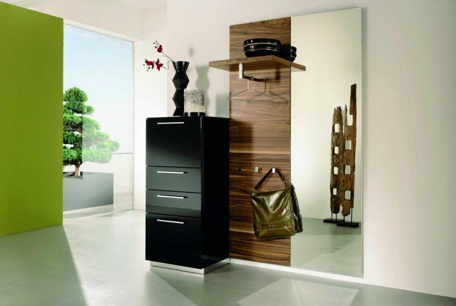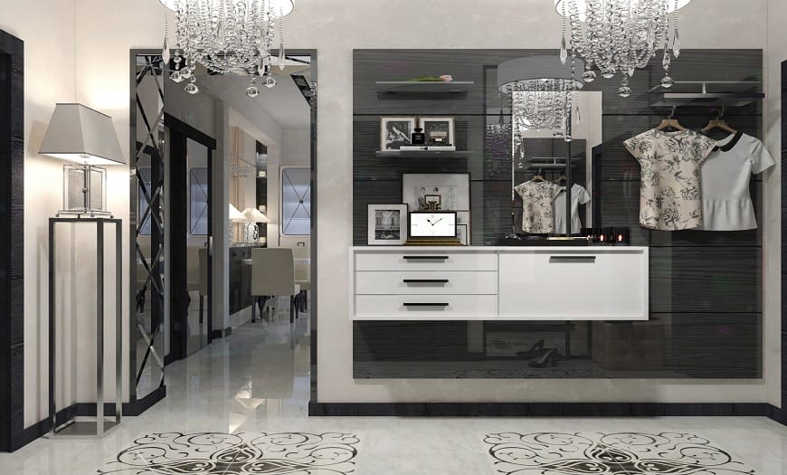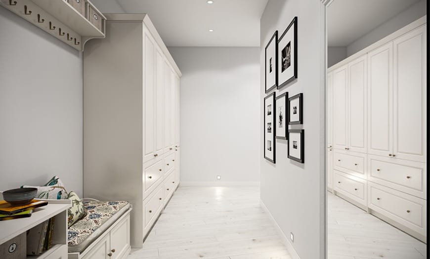 Проще всего работать с квадратом или не слишком длинным прямоугольником. С одной стороны от двери можно расположить встроенный шкаф, с другой — зеркало, вешалку с пуфом, этажерку или банкетку. Либо поставить всю мебель по одной стене, а вторую оставить практически пустой, добавив лишь немного декора или поставив красивое зеркало во весь рост.