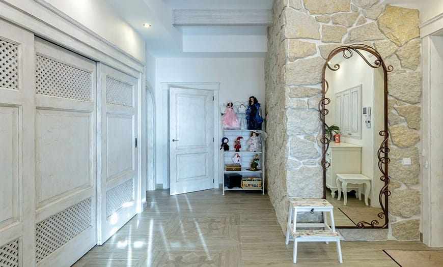 Создать оригинальный дизайн холла или просторной прихожей, что по площади приближается к жилой комнате, намного проще, чем для нестандартной планировки. Но в многокомнатной квартире часто прихожая выступает своеобразным «островком», куда сходятся все выходы/входы и расположено сразу несколько дверей. Для таких проходных комнат, стилизуемых в светлых оттенках, рекомендуется подбирать соответствующий декор для стен.