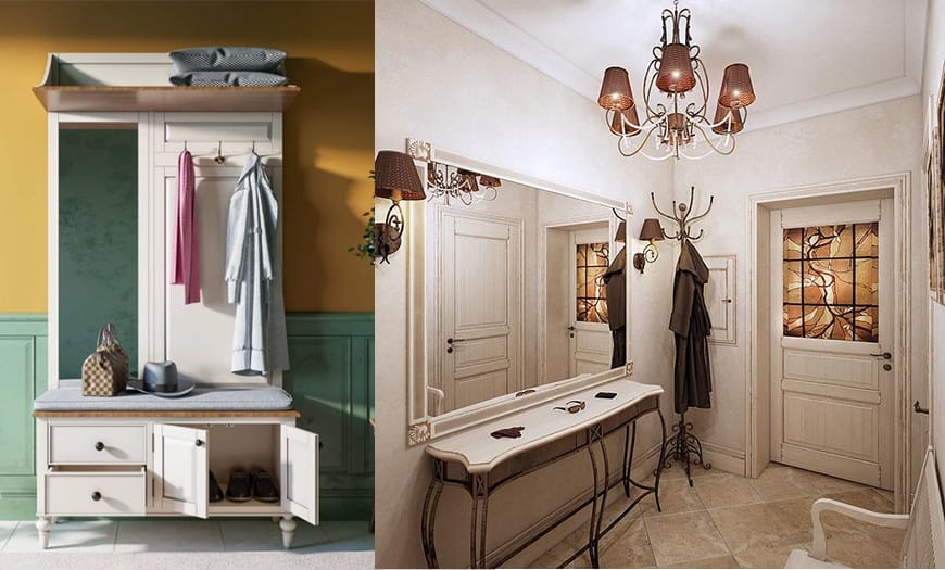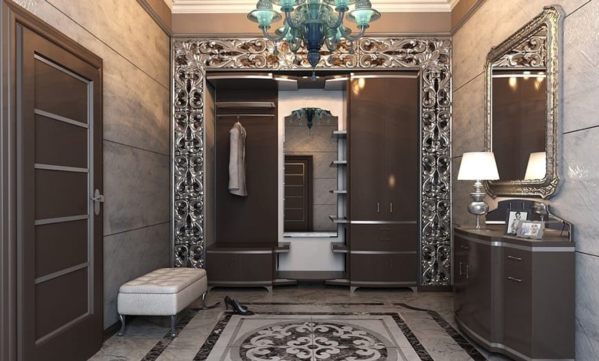 Классический. Здесь дизайнеры советуют использовать бежевую палитру и золотистый цвет. В качестве декора могут выступать кованые элементы, резьба, инкрустация. Классическая прихожая будет выглядеть роскошно и изысканно.