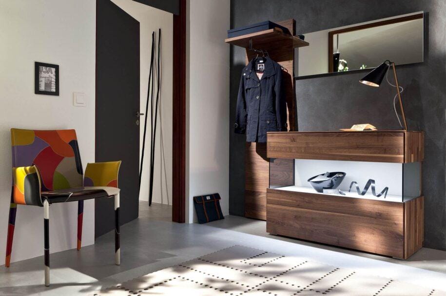 Такие прихожие неудобны тем, что занимают в квартире много пространства. Когда входишь в помещение, создается впечатление, что все комнаты оторваны друг от друга, поэтому выдержать единый стиль во всей квартире довольно сложно. Оптимальный вариант – уменьшить прихожую или осуществить зонирование. Уберите часть ненужной стены и увеличьте гостиную комнату или спальню или просто визуально разделите комнату на части при помощи игры света и материалов.