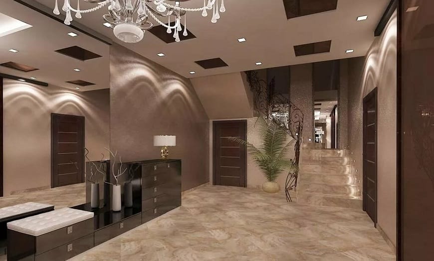 Отделка широкого входного пространства должна проводиться с учетом тех же правил, что и для других случаев. Оформление пола должно быть достаточно надежным, подойдет керамическая плитка или прочный линолеум. Оформить стены можно моющейся краской или декоративной штукатуркой. Выделить это помещение можно при помощи различных цветов, интересных отделочных материалов, многоуровневых полов или потолочных конструкций. Так как в широкой прихожей места достаточно, то меблировка может быть удобной и разнообразной.