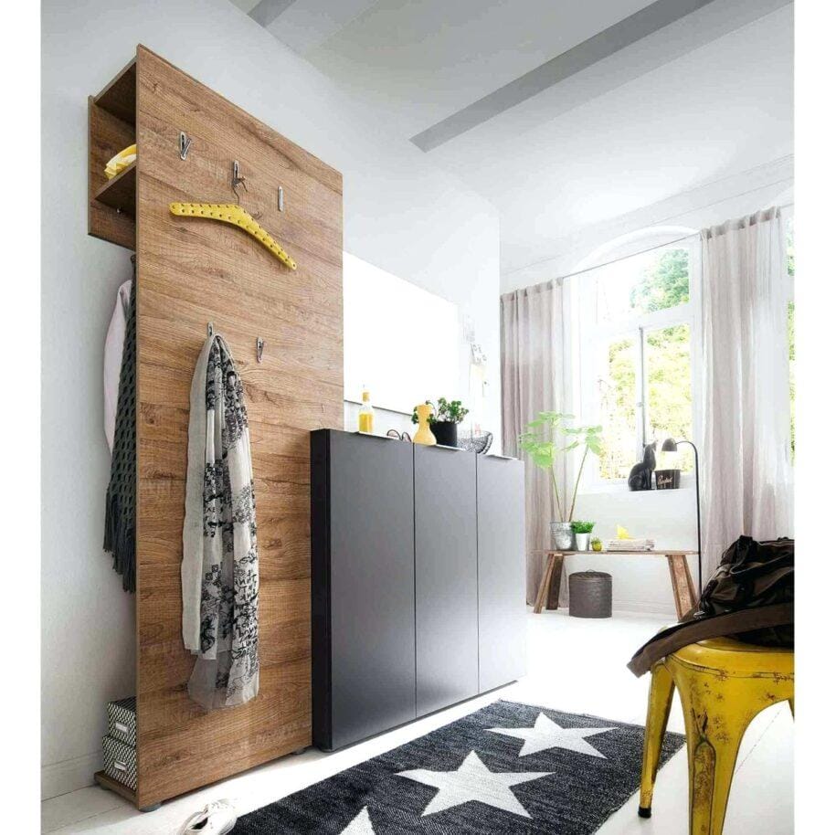 В вытянутой входной зоне важно не только разместить все необходимое, но и зрительно скорректировать пропорции. Для этого используйте: