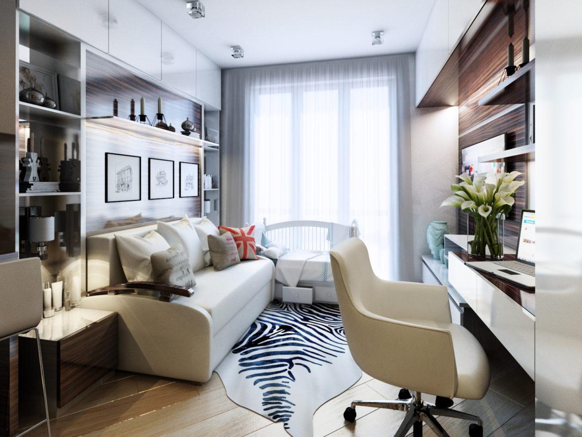 Чтобы визуально расширить и увеличить пространство, необходимо использовать светлые обои и потолки. В комнате также должно быть достаточно света, поэтому лучше всего подбирать шторы в светлых тонах, добавить достаточное количество разных светильников.