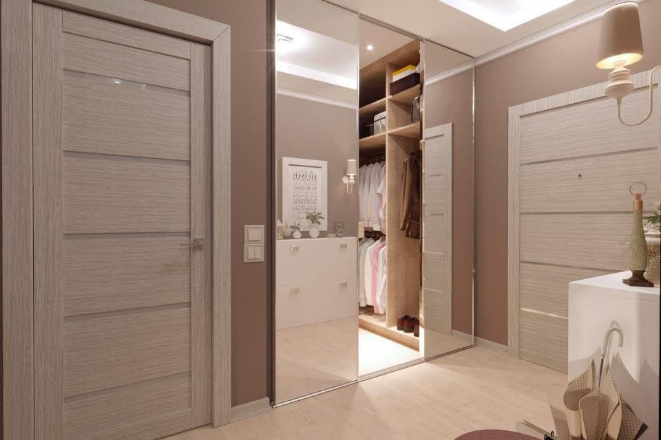 Отличным решением для хранения вещей будет шкаф-купе. Его можно встроить в нишу в прихожей, если она есть, что поможет сэкономить площадь. На двери шкафа установить большое зеркало, тем самым не нужно искать отдельное место для него.
